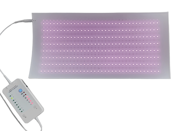 The mat contains a high density array of therapeutic LEDs that deliver uniform red and near infrared wavelengths to support cellular repair and circulation.